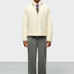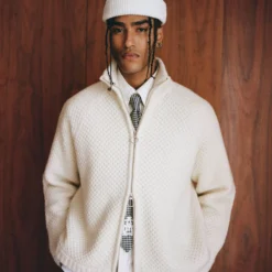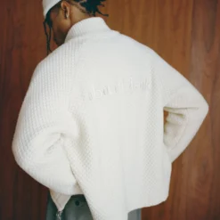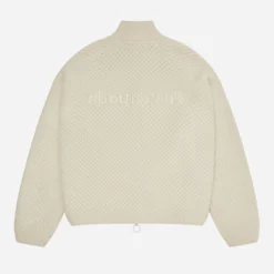 It features a honeycomb knit wool blend, double zipper and a tonal brand 3D build embroidery on the back.