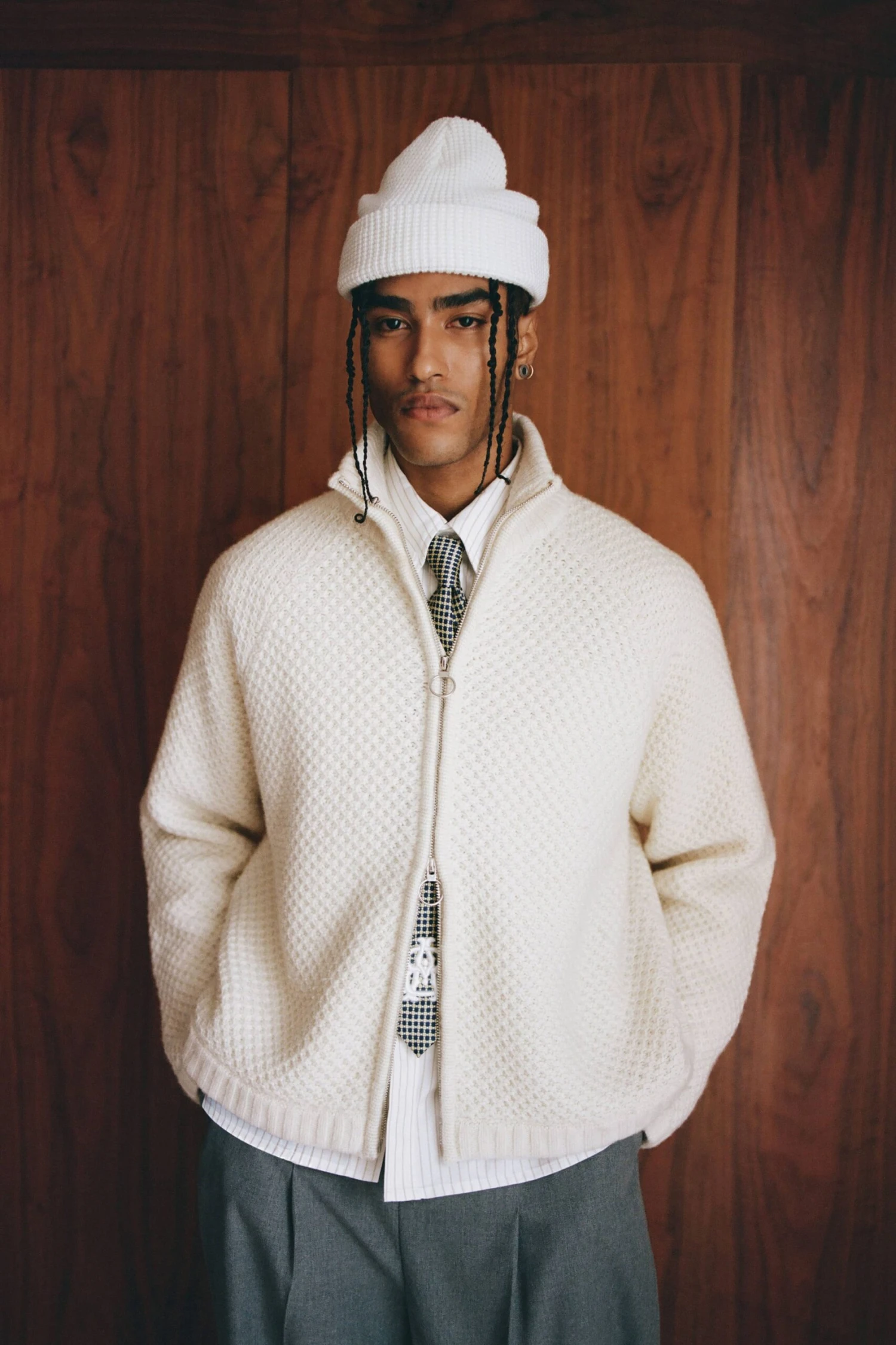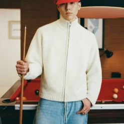 The bobble knit zip-up funnel has performance-meets-softness energy, structured enough to replace a jacket but light enough to be layered under one when the weather switches up.