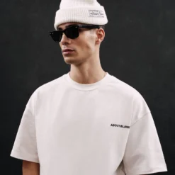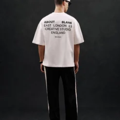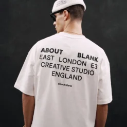 Our creative studio tee features white silicon print branding at the chest and across the back of the shoulders. It’s made from a structural 340gsm cotton jersey and is cut with dropped shoulders and a slightly cropped hem to create our signature oversized, boxy silhouette.
