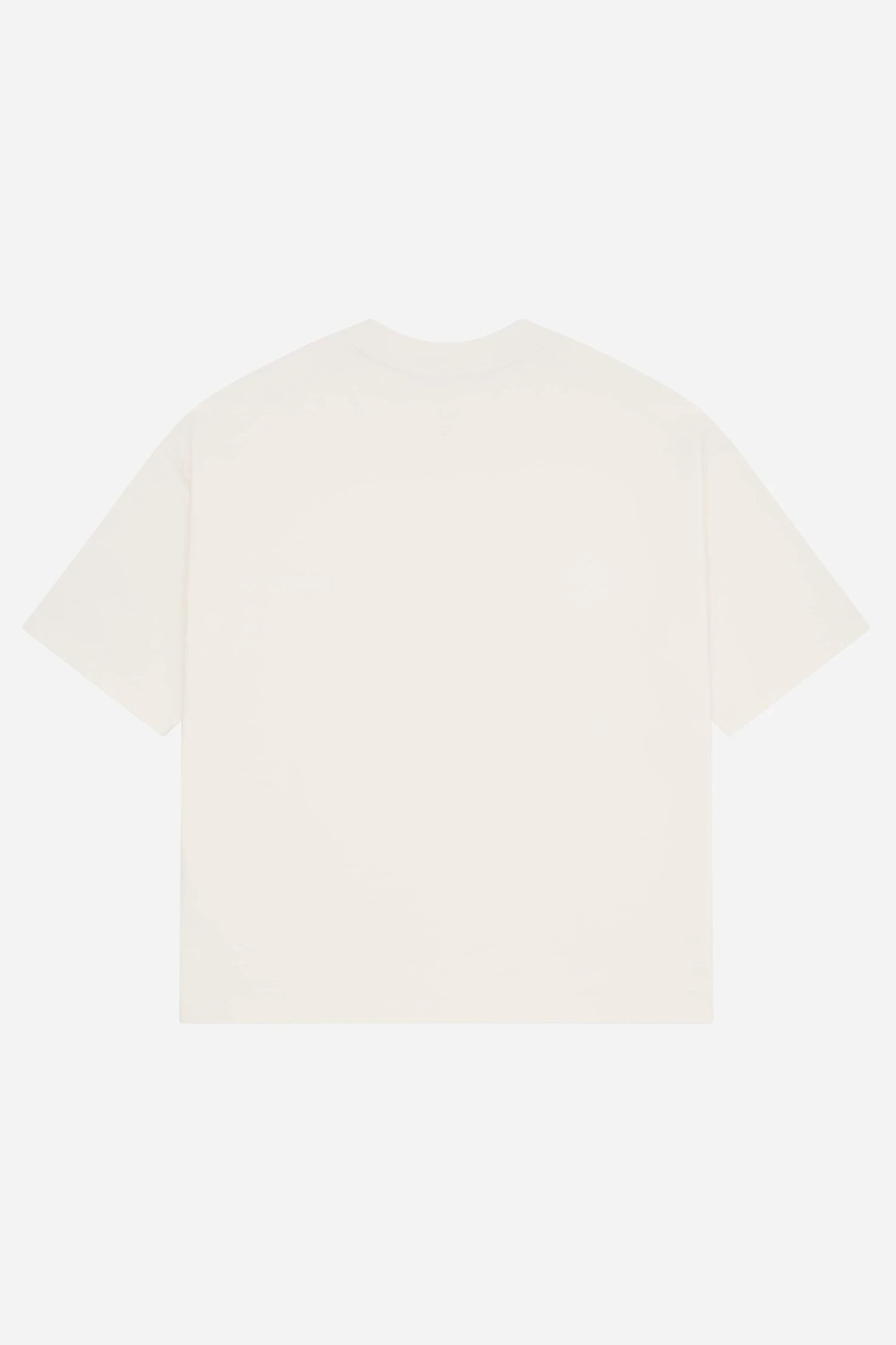 A heavyweight 340gsm cotton tee with a 3.5cm mock neck, contrast raised screen print across the chest, and tonal colon embroidery at the back neck. Built on the Josef block with twin-needle finishing and no visible topstitching at the side seam for a cleaner silhouette