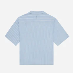 A short-sleeve resort shirt cut in 140gsm cotton with a revere collar and updated fit. Features red chest embroidery, a button-loop collar closure, back darts for shaping, and a three-dot back neck stitch.