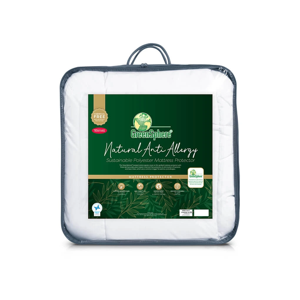 This premium Tontine GreenSphere® Natural Anti Allergy Mattress Protector features a premium cotton japara cover treated with GreenSphere® to provide plant-based, chemical-free protection & elimination of bacteria and dust mites, which are a common trigger for asthma and allergies.