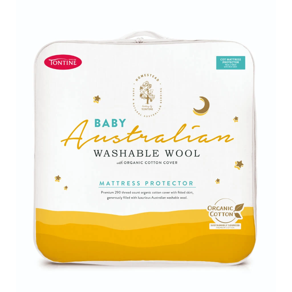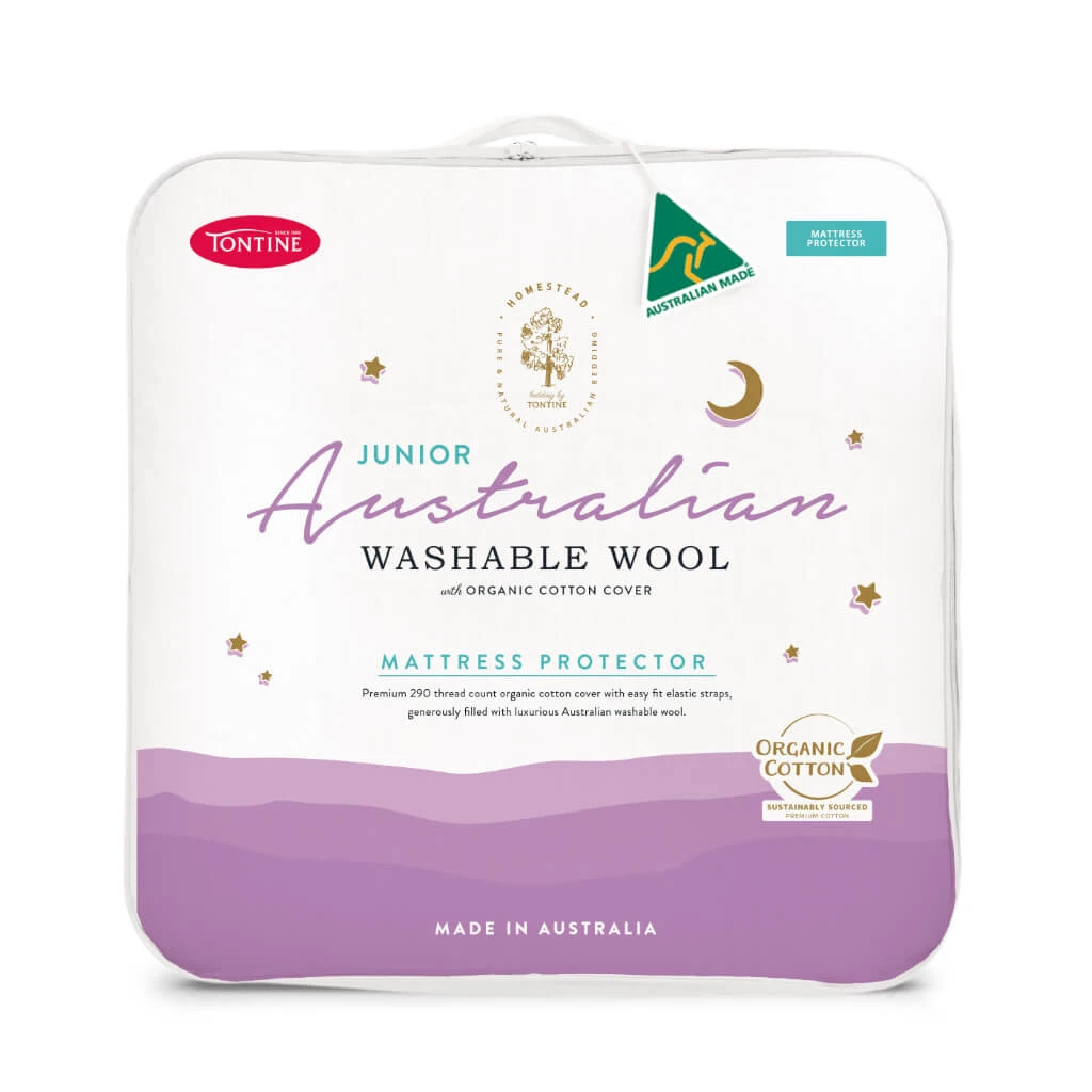 The Tontine Homestead Baby/Junior Australian Washable Wool Mattress Protector is made with soft, organic cotton and washable Australian wool. This protector offers temperature regulation and a cosy sleep. The self-bound edge and corner straps ensure a secure fit. Perfect for protecting your child’s mattress.