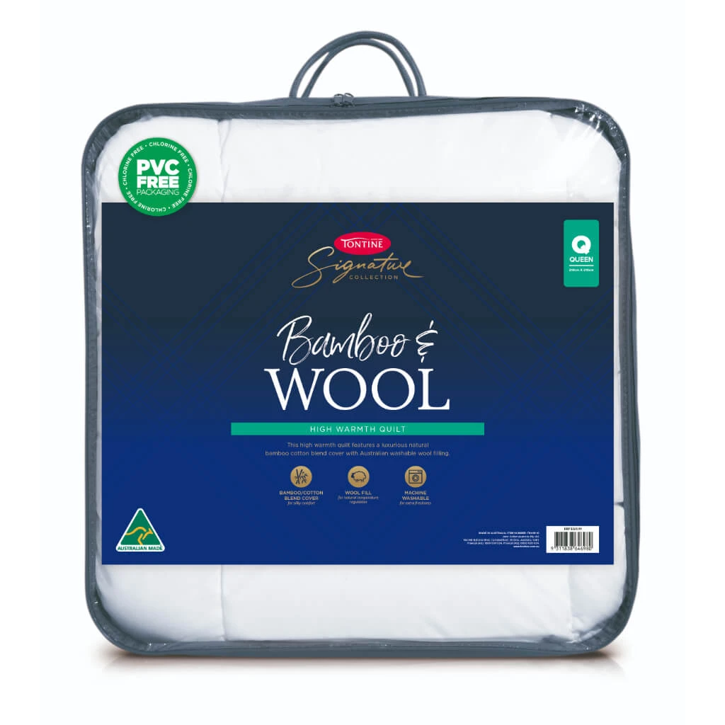 This Tontine Signature Bamboo Cotton Washable Wool Quilt provides luxurious warmth with a natural bamboo cotton blend cover and Australian washable wool filling. With a high warmth rating, this quilt is perfect for colder months.