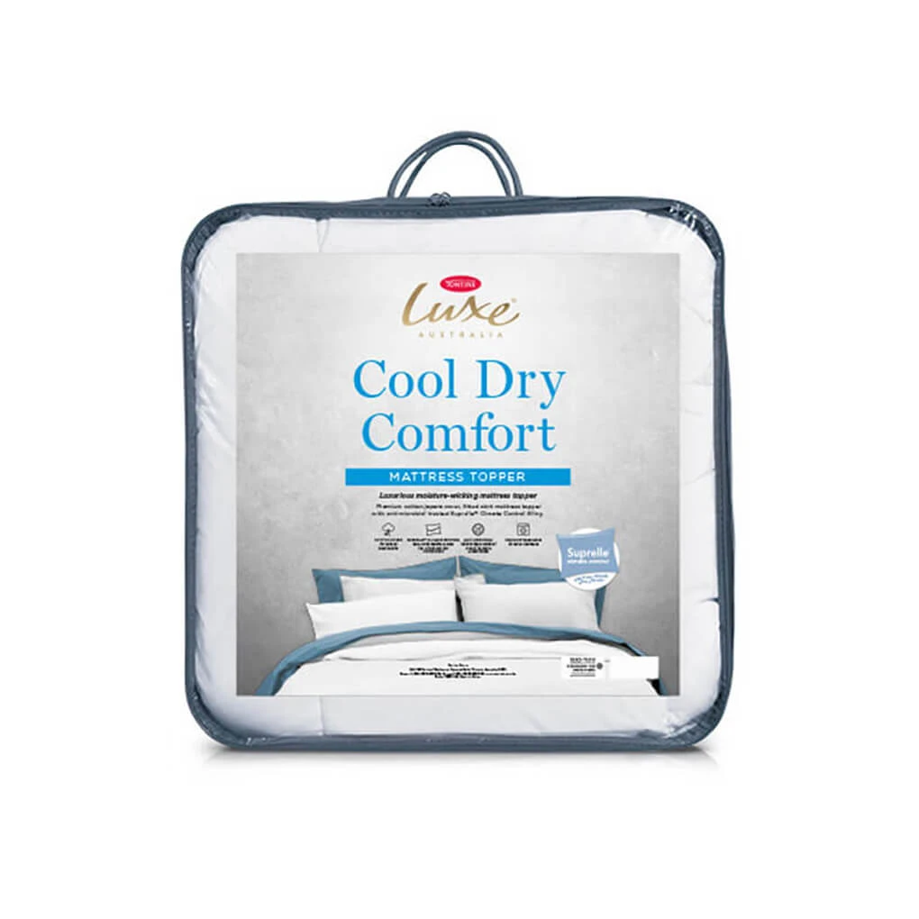 This premium quality Tontine Luxe Cool Dry Mattress Topper features a premium cotton japara cover for luxurious softness & breathability along with special climate control fibres that help you to stay cool, dry and comfortable throughout the night.